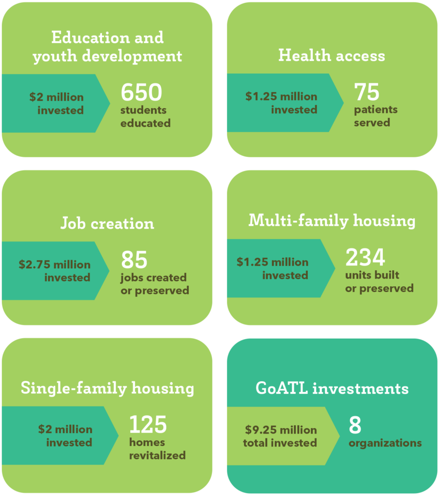 Launched in 2018, the GoATL Fund provides flexible, cost-effective loans to organizations supporting investments into low-income individuals and families throughout metro Atlanta. As the region’s first diversified impact debt fund, GoATL provides a unique source of funding to amplify our grantmaking and strengthen affordable housing, education and entrepreneurship. Learn more about the GoATL Fund here.